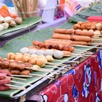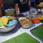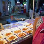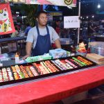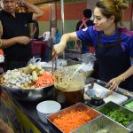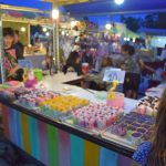 Ensuite, nous sommes allés au marché de nuit où se mélange stands de « bouffe », de téléphones ou encore d’habits… Les stands étaient vraiment très originaux. Entre les sushis et les cup-cakes colorés, en passant par les scorpions grillés, les brochettes de coeur de poulet, les nuggets-frites, les spaghettis à la bolognaise, les pad-thaï, les currys et les soupes… bref, un bon moment pour nous 4… euh nous 2. Pour 4 plats et 3 desserts, nous avons payé 185 Baths soit 4,5Euros…